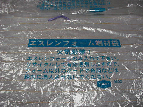 右上は 畳を作った後のごみです。かなり大量に出ます。この中からポリスチレンフォームだけをきれいに抜き取ります。糸くず・紙テープなど不純物が混じらないように慎重に選別します。こうすることにより、かなり高品質のリサイクルが可能になります。